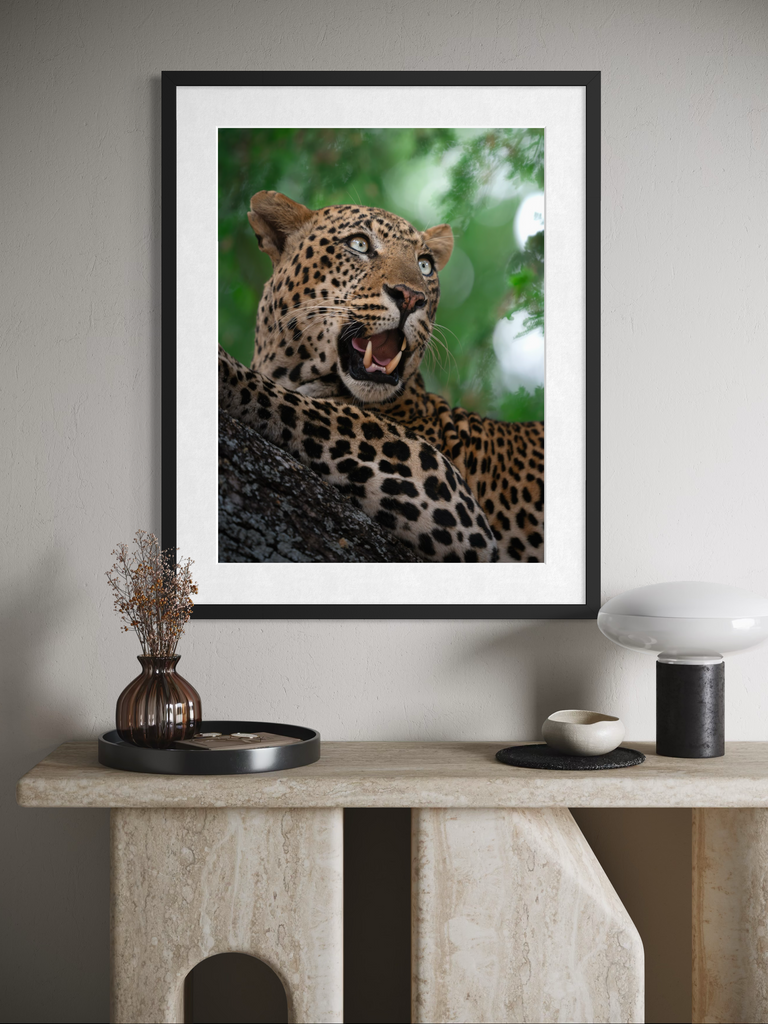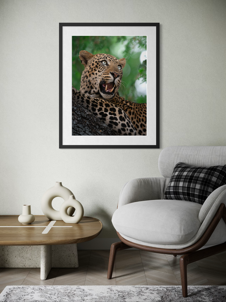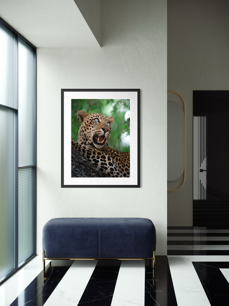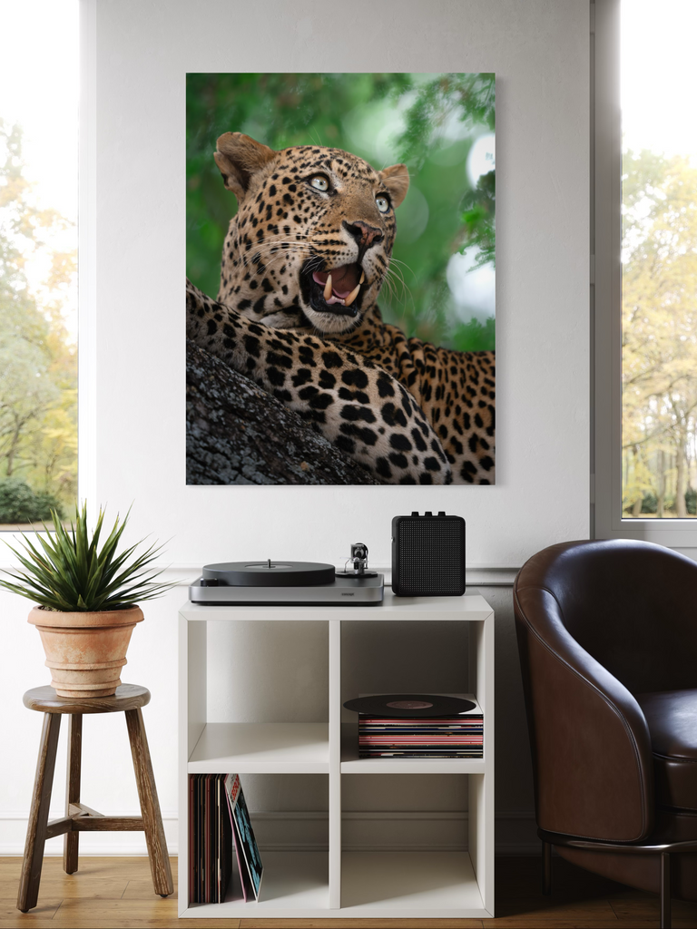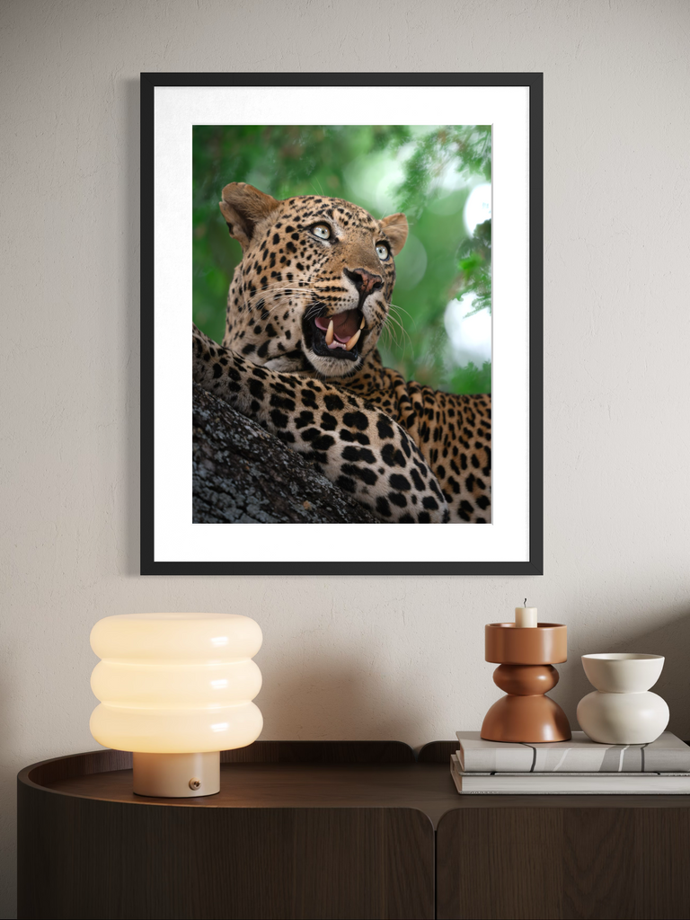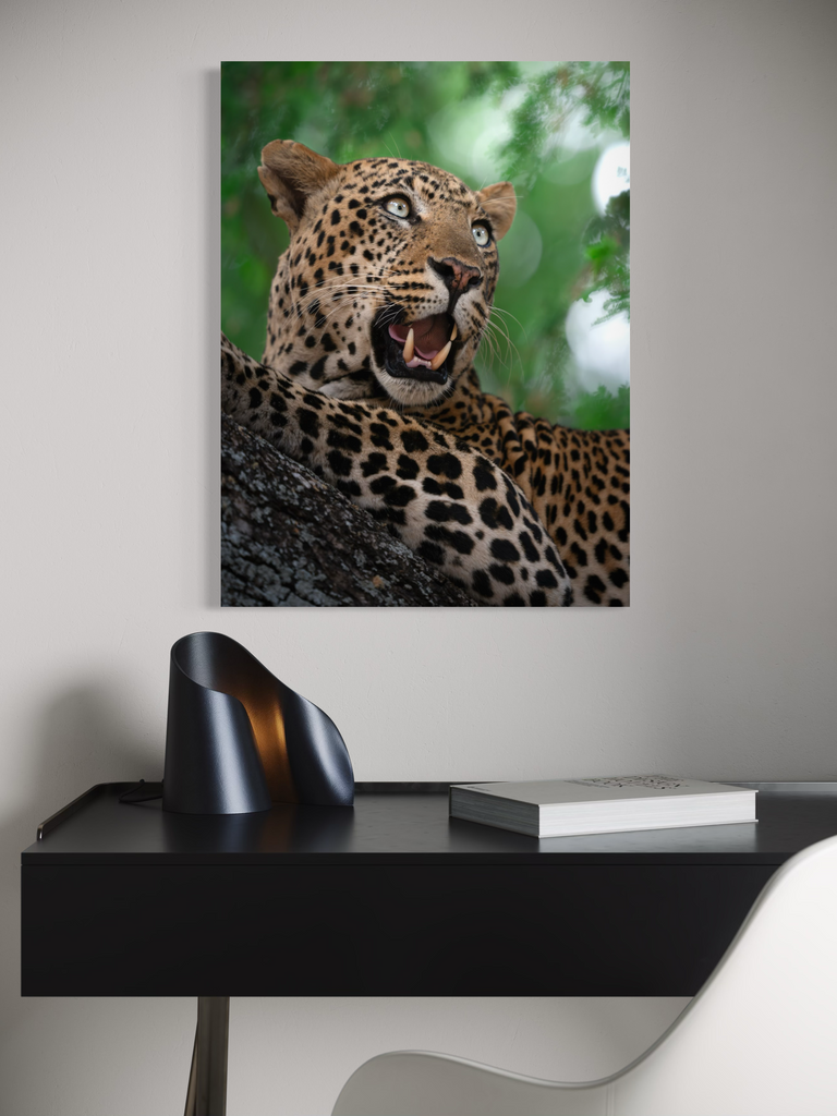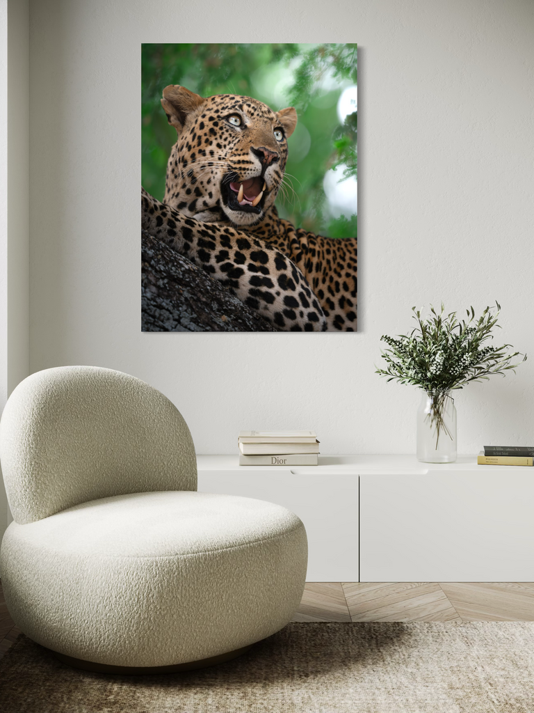 "Un ritratto vibrante e magnetico di un leopardo nel pieno del suo splendore. L’intensità dello sguardo, il manto maculato perfettamente definito e il verde vivido della vegetazione circostante trasmettono energia pura e presenza selvaggia."