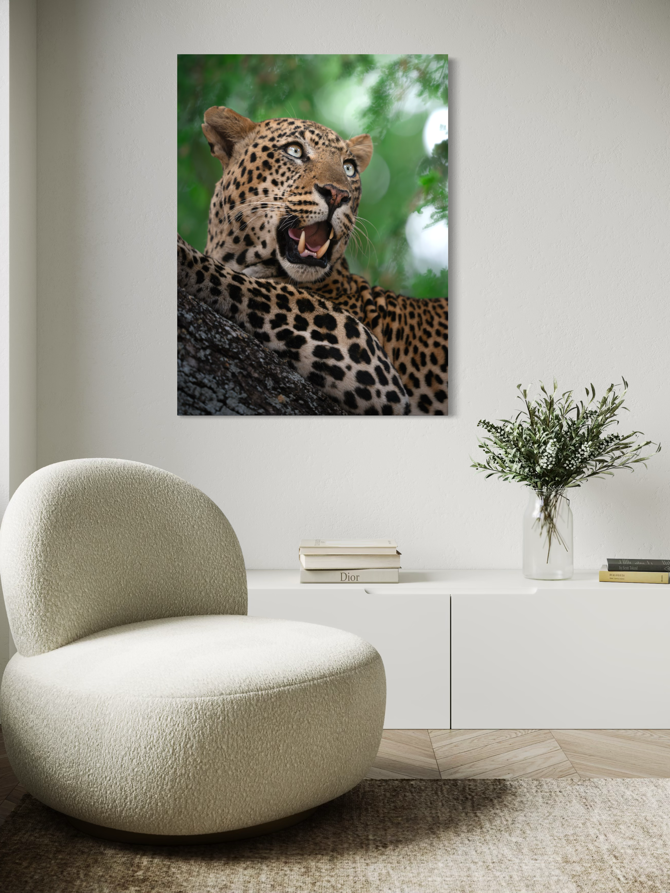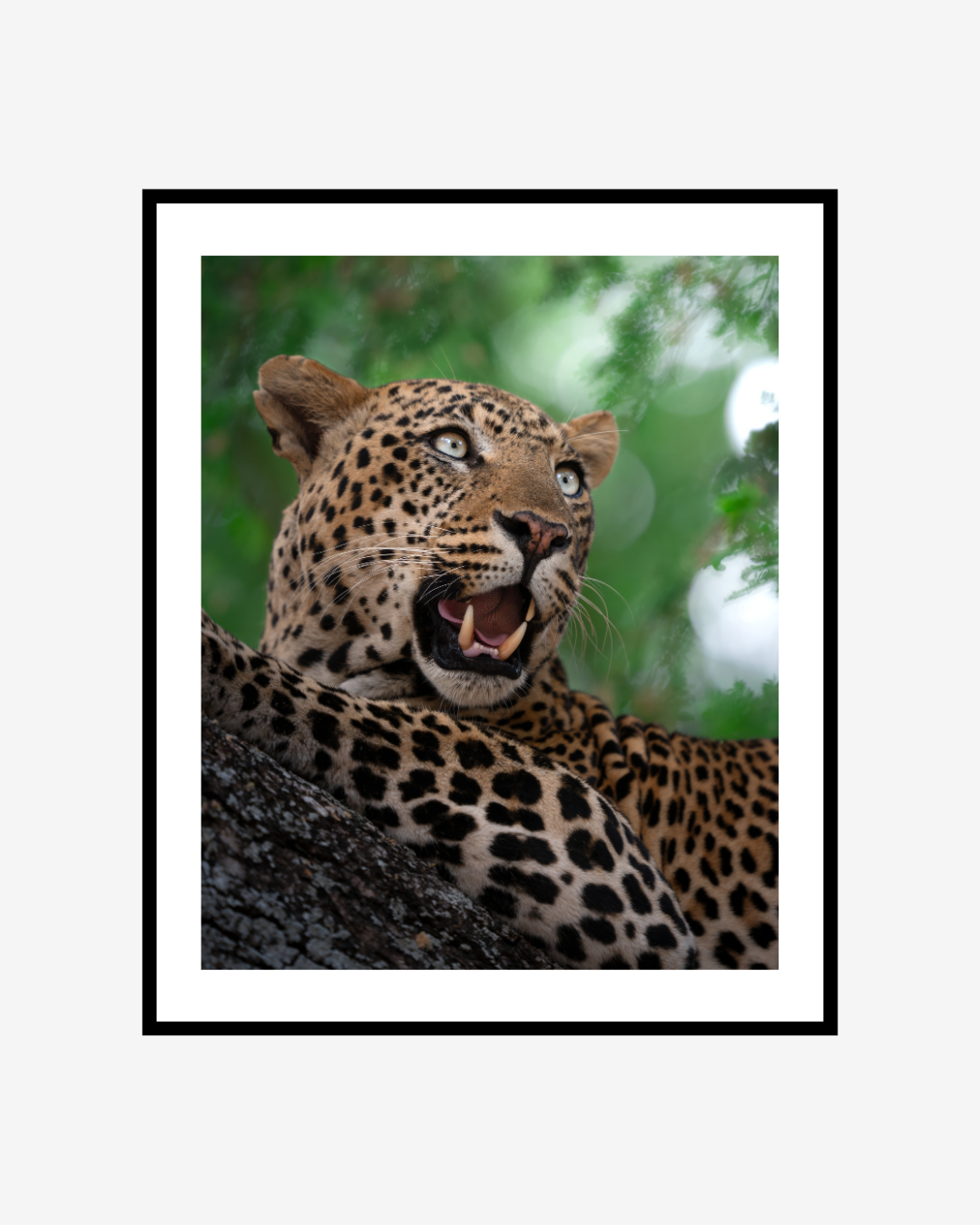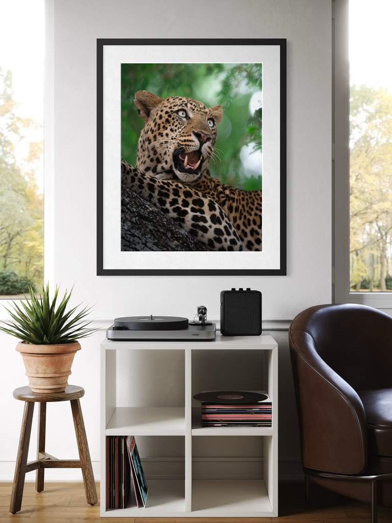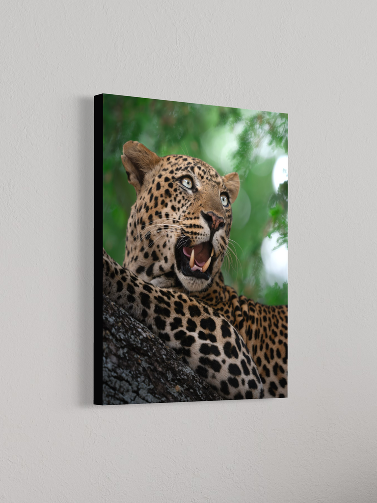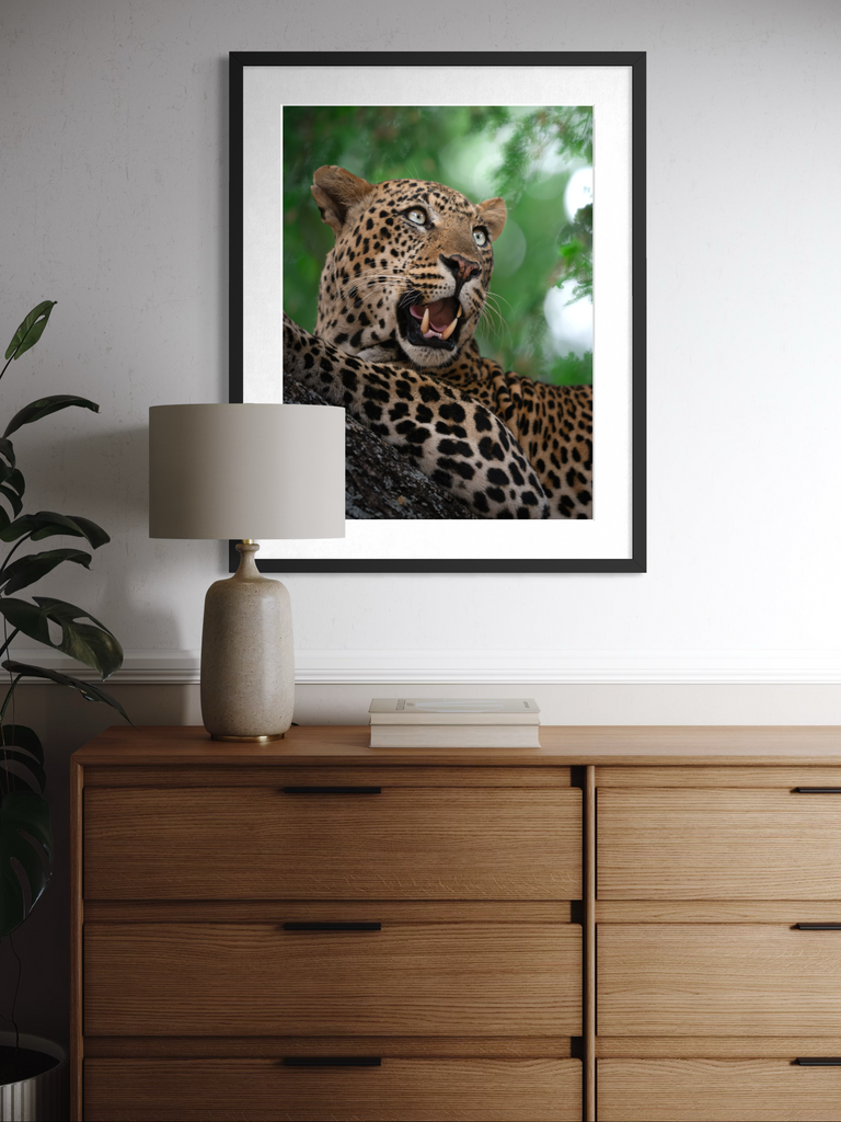 "Un ritratto vibrante e magnetico di un leopardo nel pieno del suo splendore. L’intensità dello sguardo, il manto maculato perfettamente definito e il verde vivido della vegetazione circostante trasmettono energia pura e presenza selvaggia."