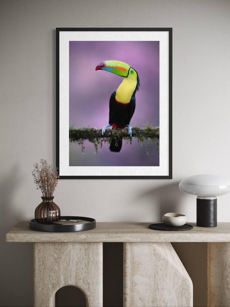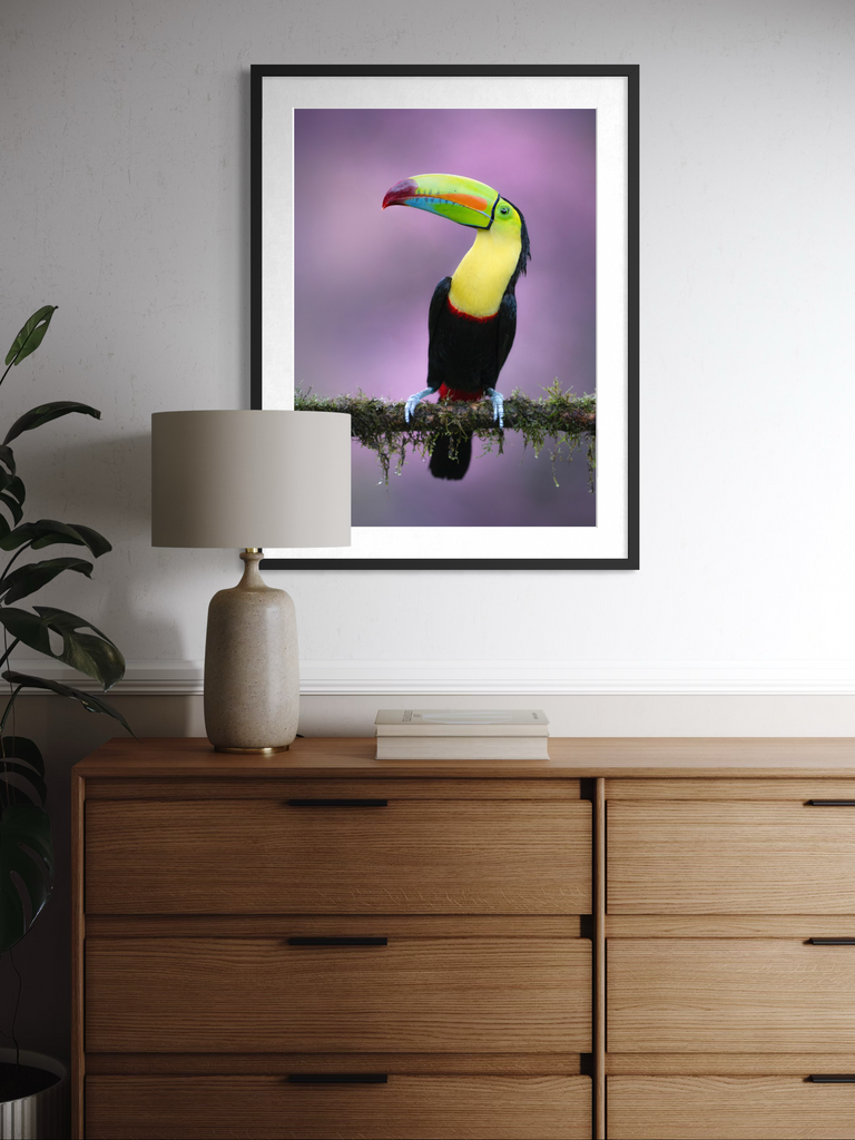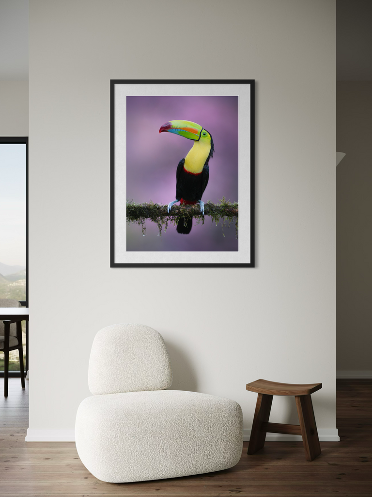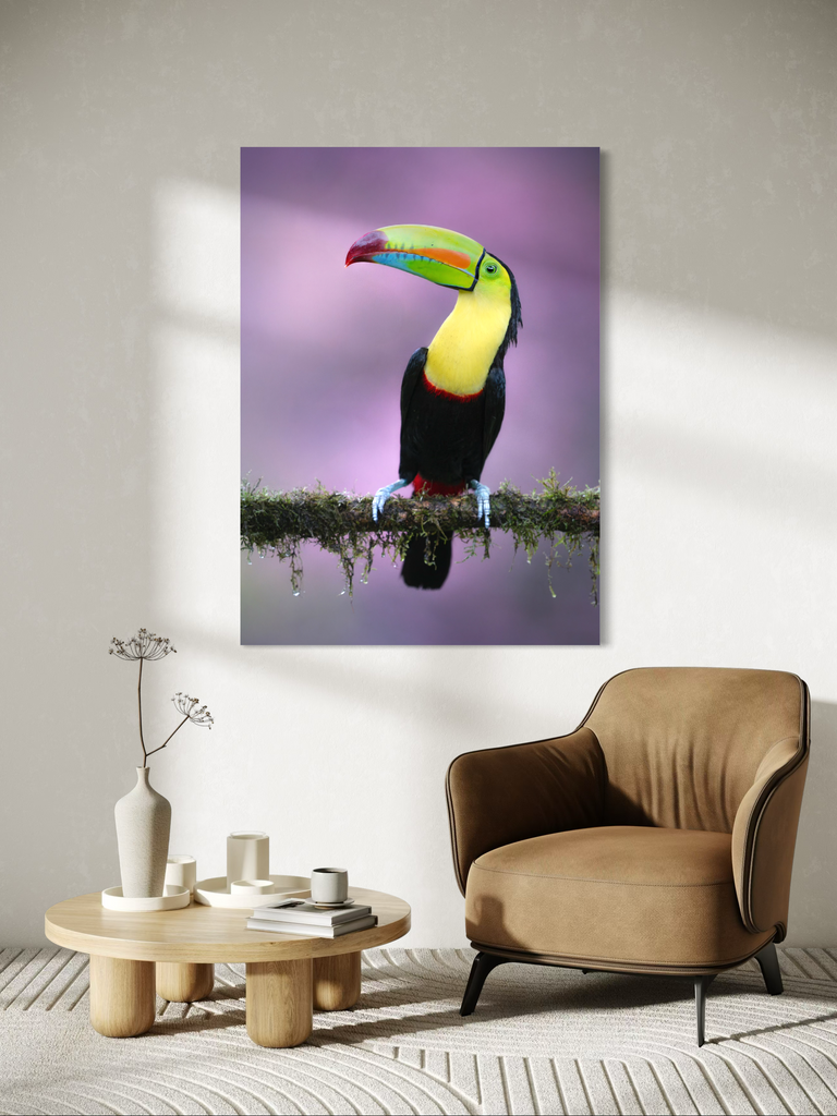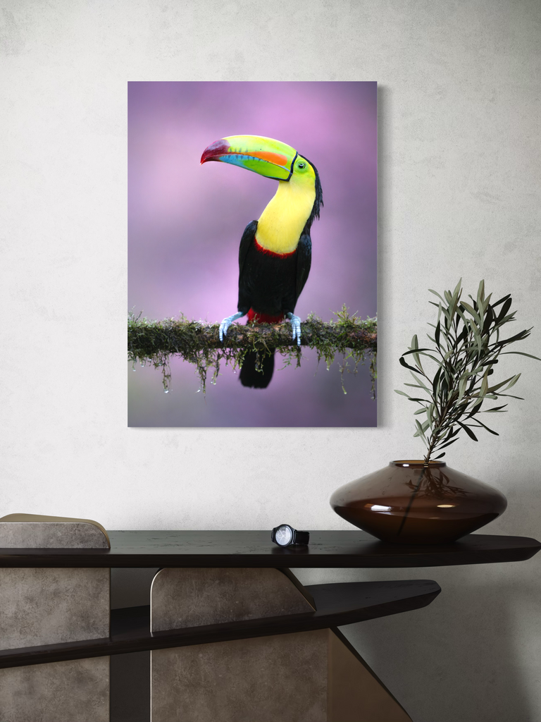 "Una vibrante celebrazione della bellezza esotica: quest’opera ritrae un maestoso tucano posato su un ramo, avvolto in un’atmosfera viola surreale. La silhouette decisa e il becco vivace si stagliano in armonia sullo sfondo onirico, evocando mistero, colore e serenità tropicale."