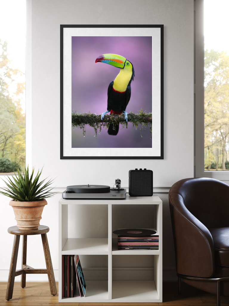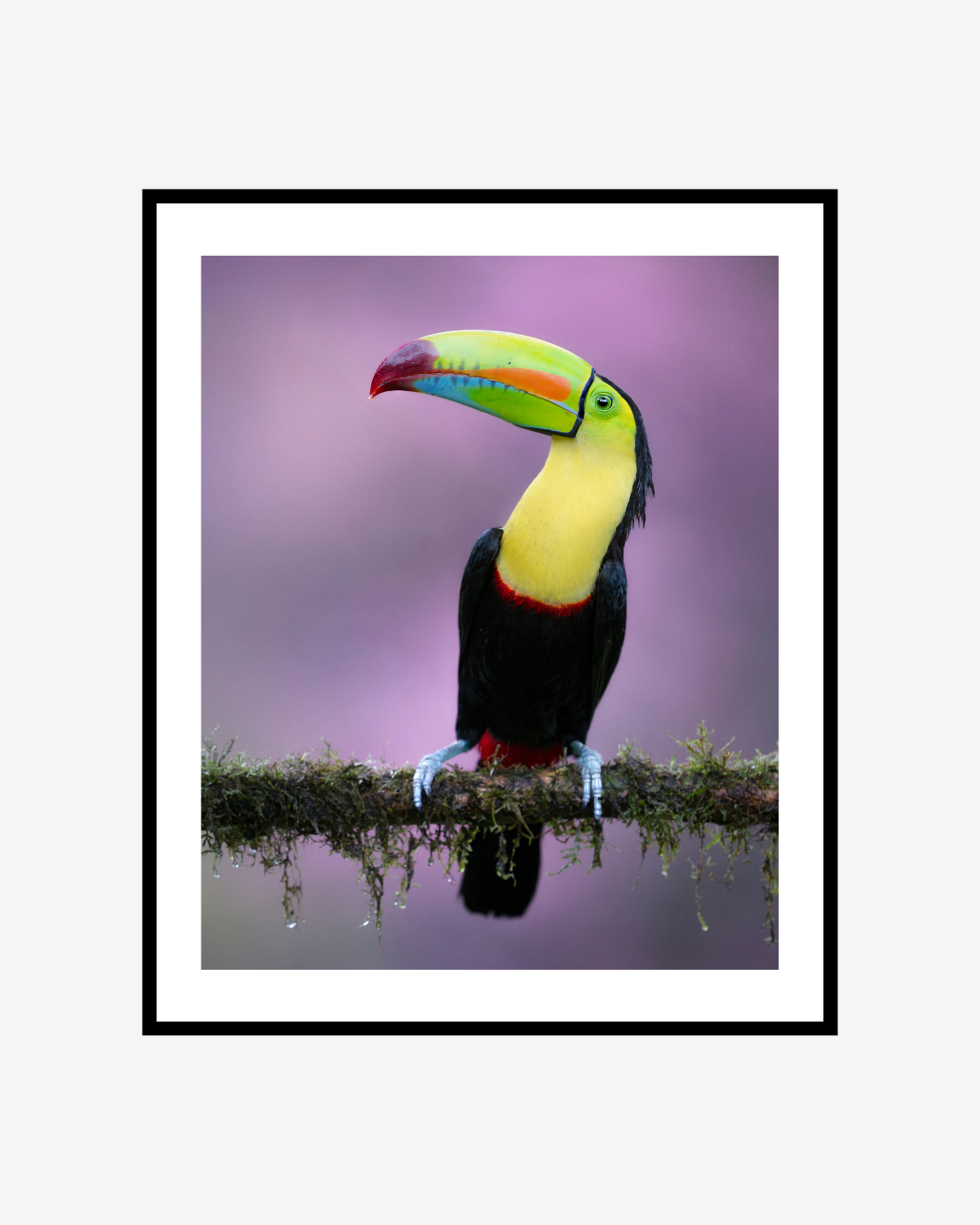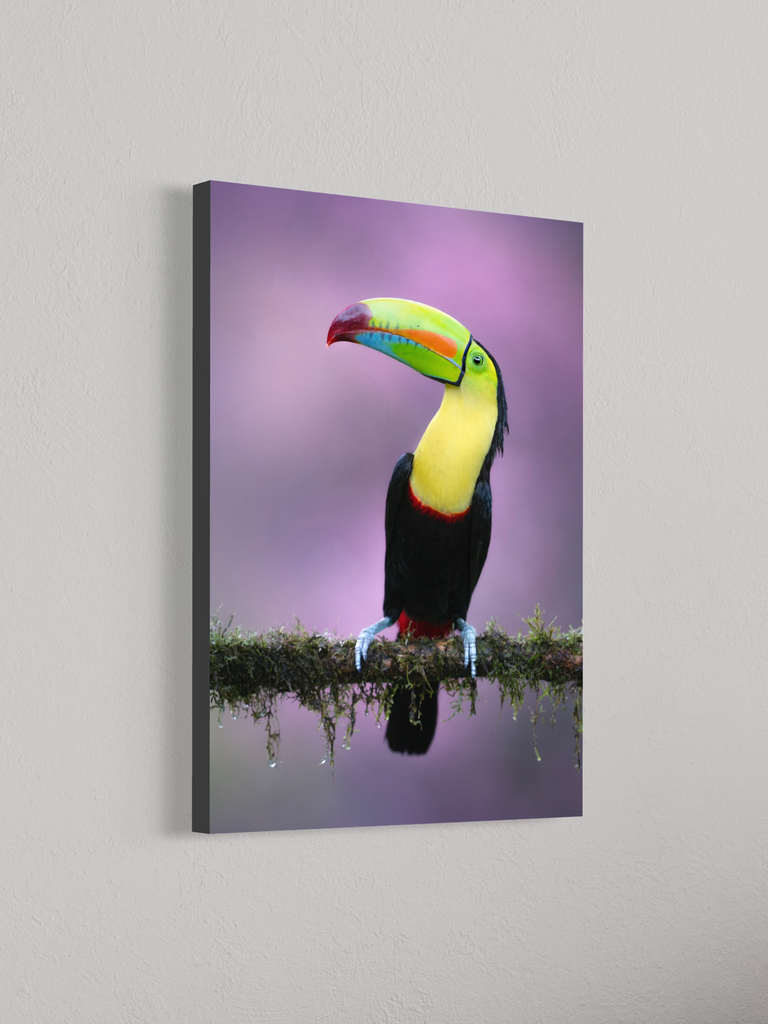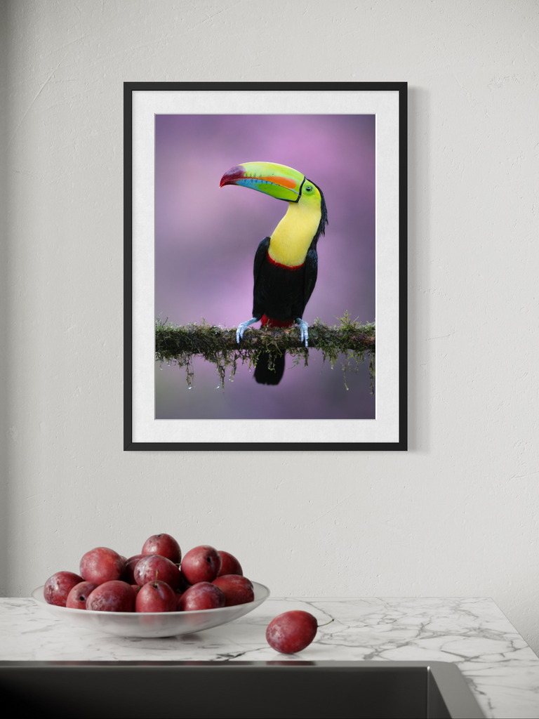 "Una vibrante celebrazione della bellezza esotica: quest’opera ritrae un maestoso tucano posato su un ramo, avvolto in un’atmosfera viola surreale. La silhouette decisa e il becco vivace si stagliano in armonia sullo sfondo onirico, evocando mistero, colore e serenità tropicale."