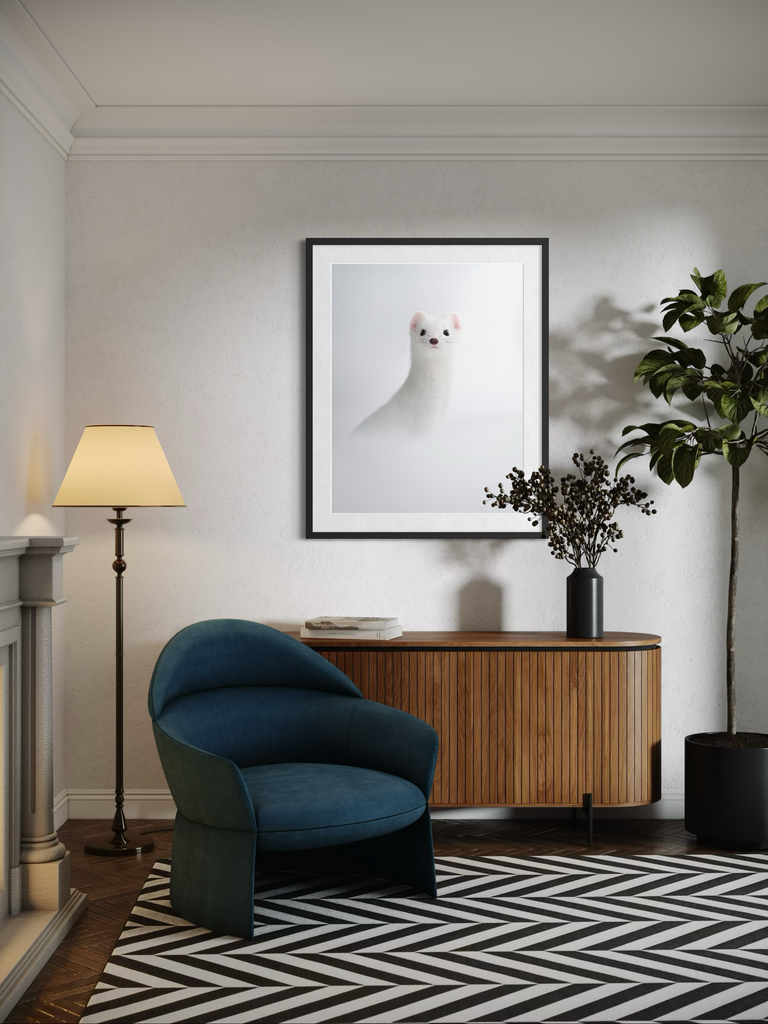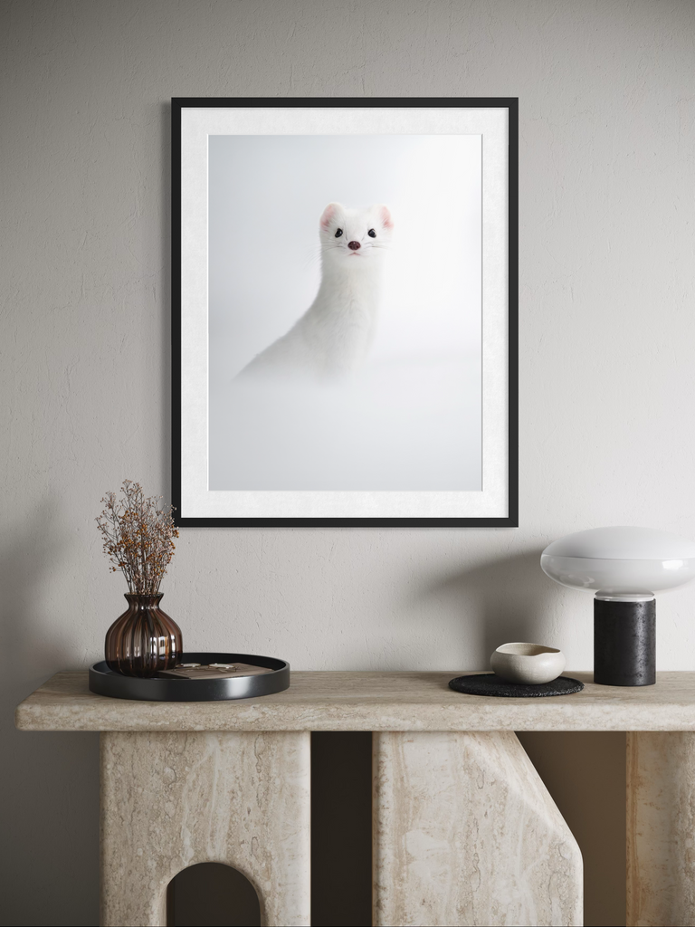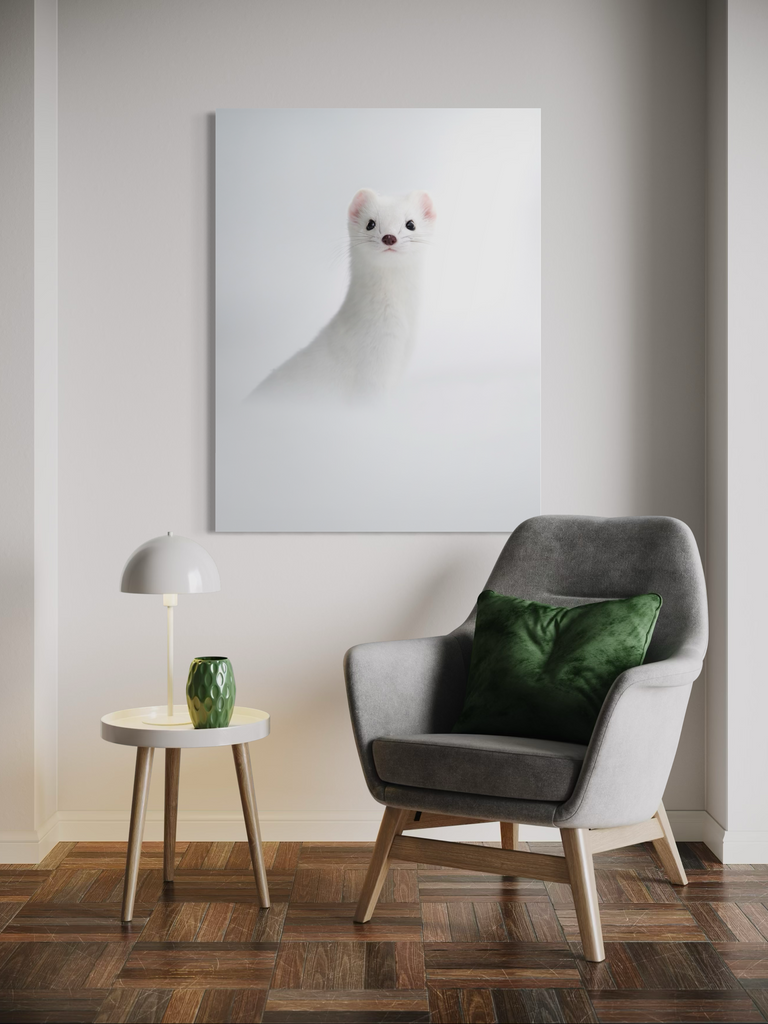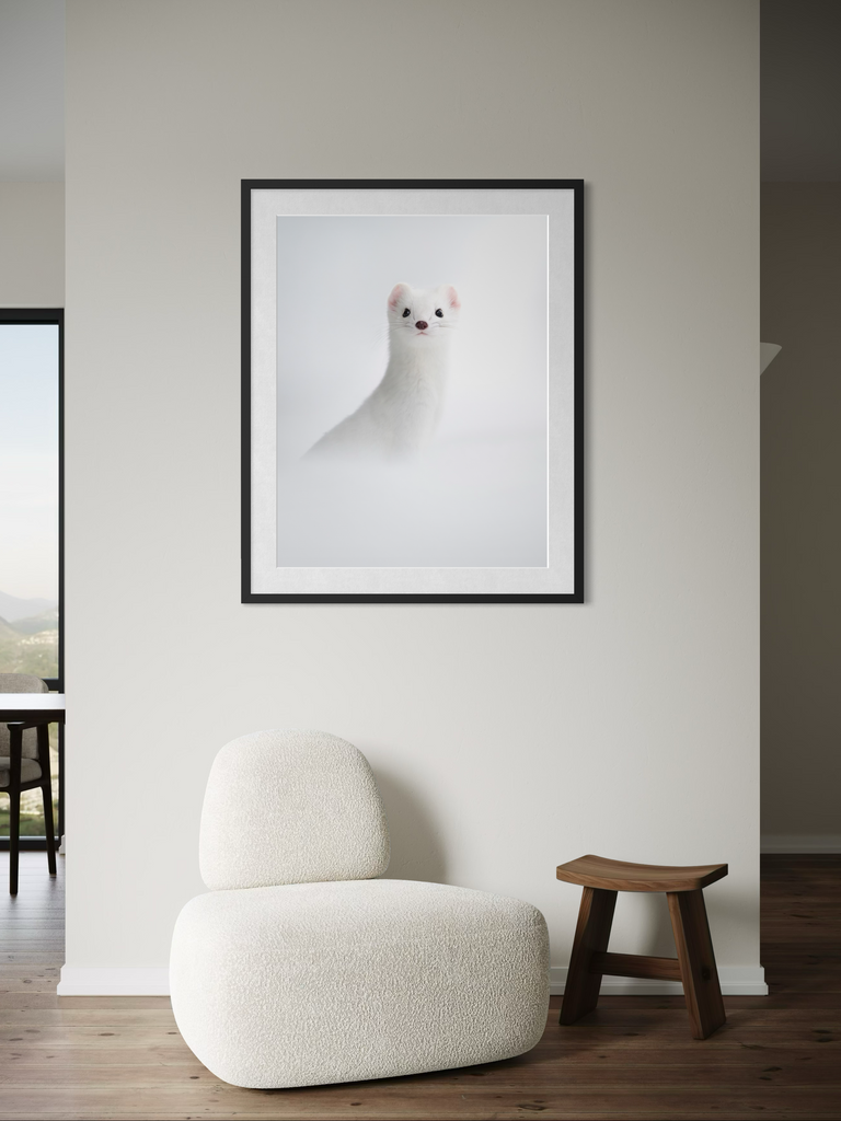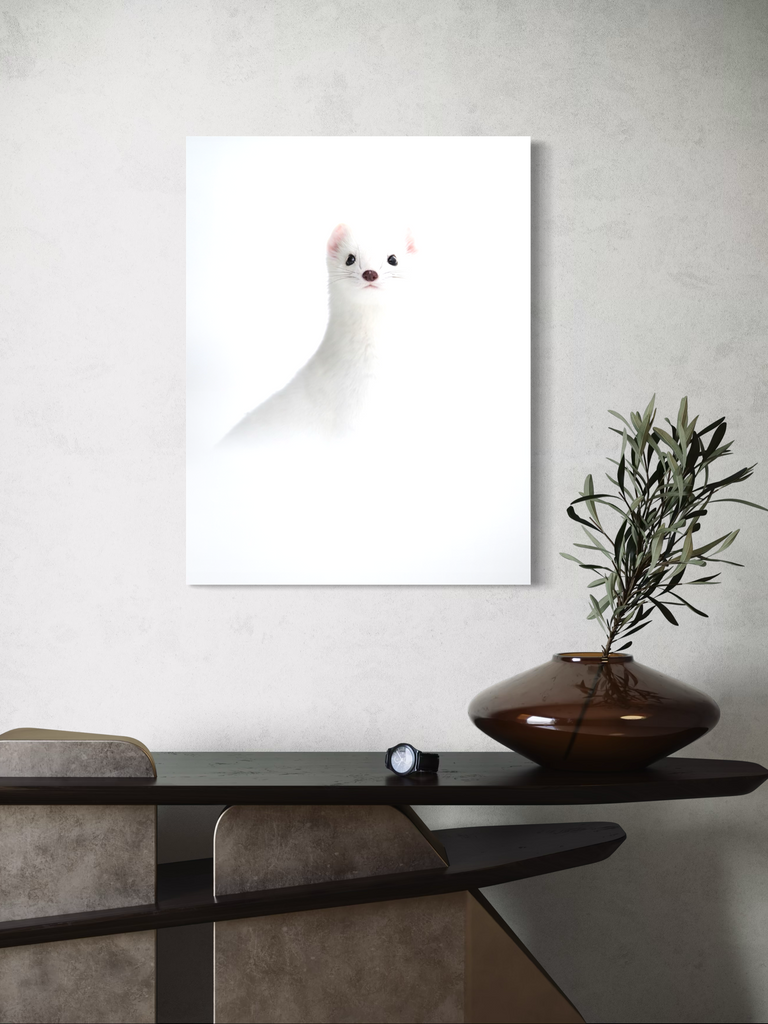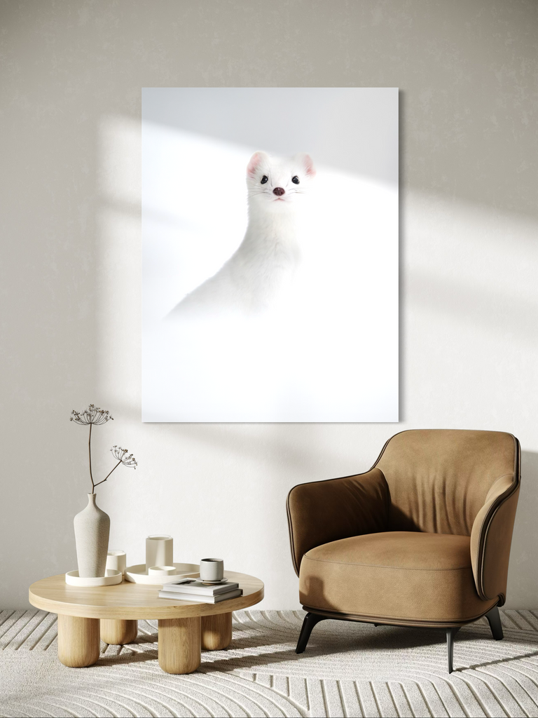 "Un ritratto puro e minimale che cattura l’essenza della delicatezza selvaggia. L’ermellino, avvolto nel suo manto invernale, emerge dal bianco assoluto con uno sguardo attento e curioso, simbolo di innocenza, grazia e misteriosa presenza nella quiete della natura."
