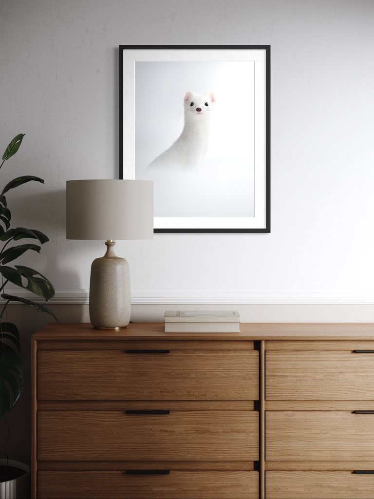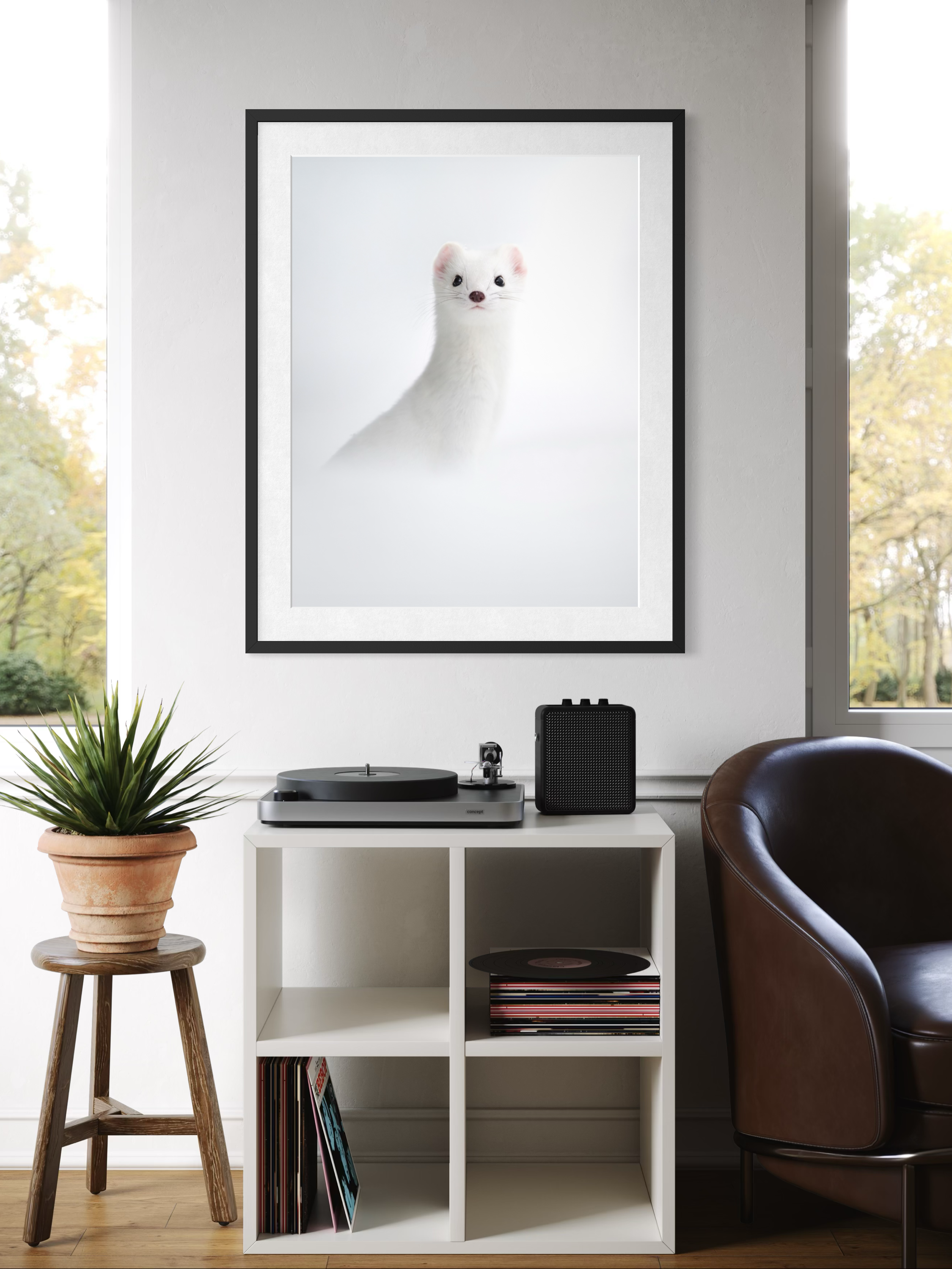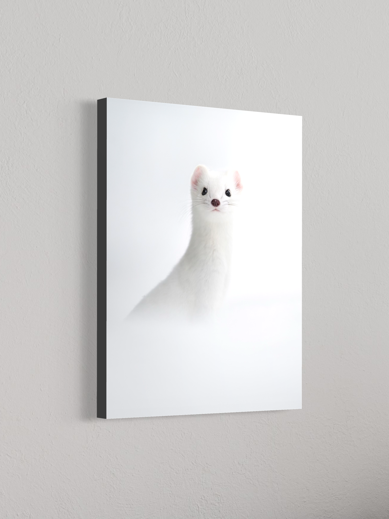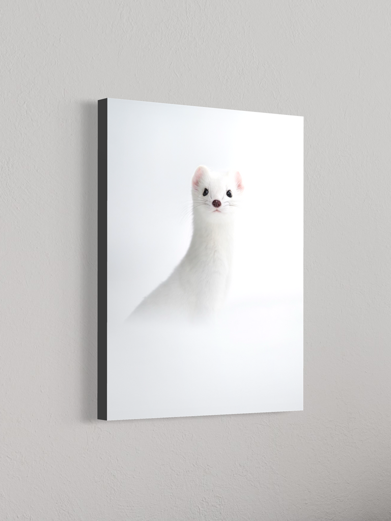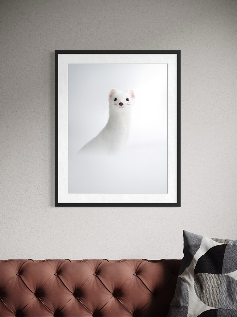 "Un ritratto puro e minimale che cattura l’essenza della delicatezza selvaggia. L’ermellino, avvolto nel suo manto invernale, emerge dal bianco assoluto con uno sguardo attento e curioso, simbolo di innocenza, grazia e misteriosa presenza nella quiete della natura."